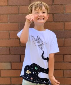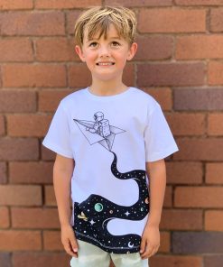 This cosmic design is hand screenprinted using quality inks onto a 100% soft cotton shirt. Artwork by Enkel Dika aka buko, an illustrator from Struga, Macedonia. Their works focus on surrealist wonders, space explorations, extraterrestrials, and a humourous astronaut touring different worlds and dimensions.